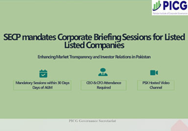 Key Reporting & Disclosure Requirements – PSX Listing Regulations View SECP’s Concept Paper – Proposed Amendments to the Companies Act, 2017 View Governance Guidelines for Non-Executive Directors Nominated by Asset Management Companies (AMCs) View SECP Mandates Corporate Briefing Session for Listed Companies View